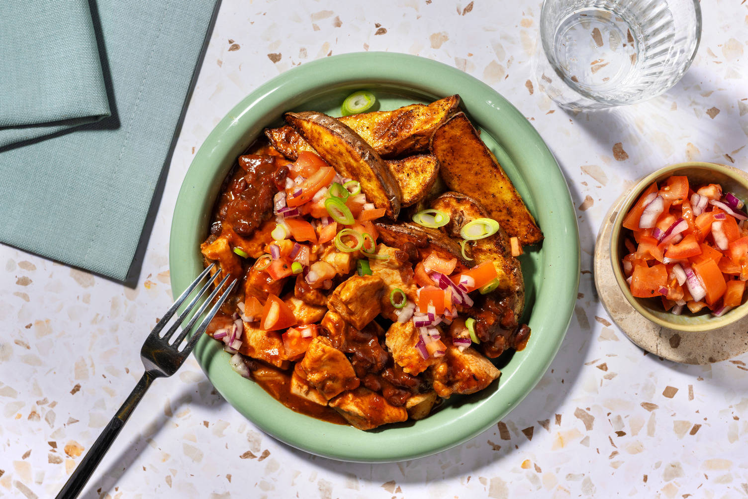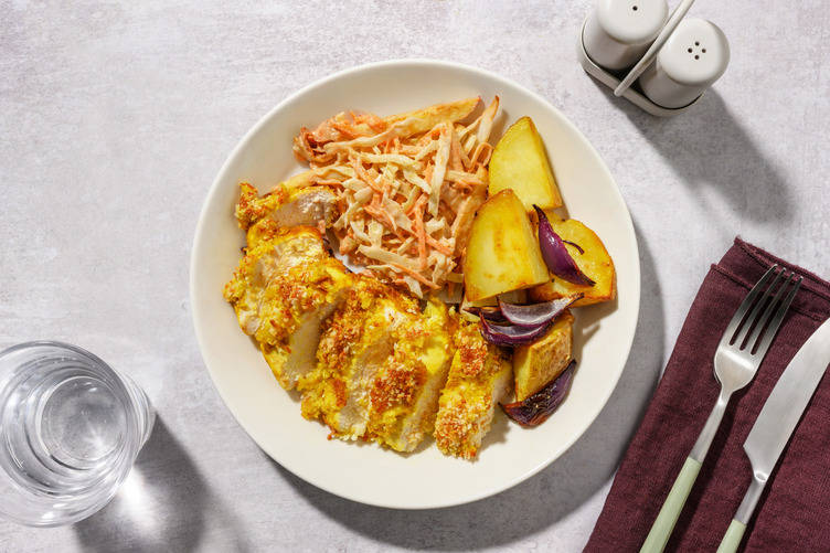 Crispy chicken coated in curried aioli is joined by slightly spiced chorizo wedges in this dish for a meal that's filled with adventurous flavours.