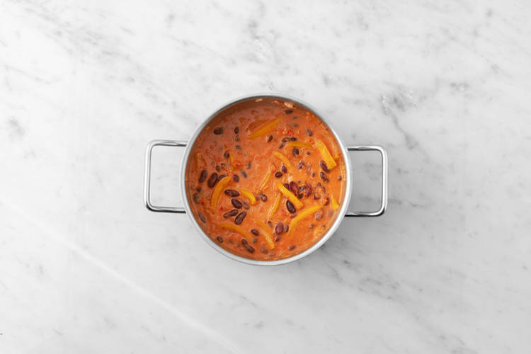 • Stir the chipotle paste and half the creme fraiche into the pot and allow to warm through, 1-2 mins.